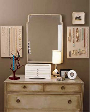 NecklacesHung in an artistic composition over a dresser or side table, doorknobs and drawer pulls make adorable hooks for jewelry. Paint the wall a dark, dramatic hue that contrasts the color of the knobs to create a whimsical, floating effect. You can find some cute knobs at Anthropologie.
