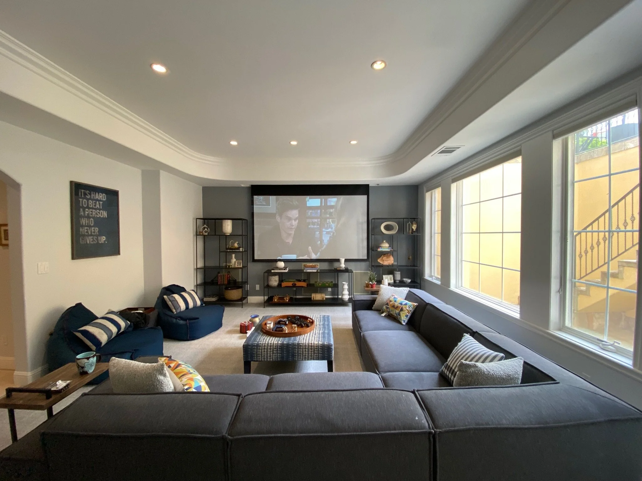 Next we added some shelving from Room & Board to anchor the screen that drops down from the ceiling. The shelving provides storage for board games and display some fun personal memorabilia.
